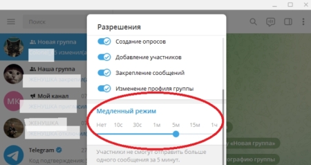 При включении этой опции участники чата смогут отправить лишь одно сообщение в установленный промежуток времени. Например, можно сделать так, чтобы пользователь смог отправить не больше одного сообщения в минуту.