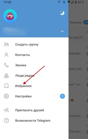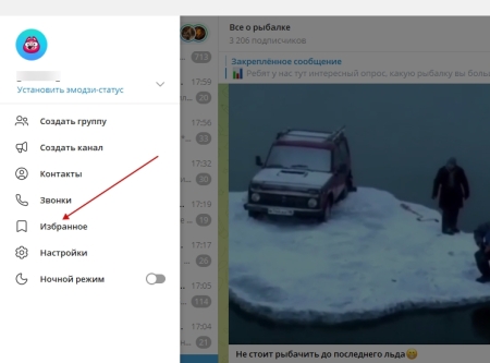- Открыть облако в Телеграмме. Для этого надо зайти в раздел «Избранное».