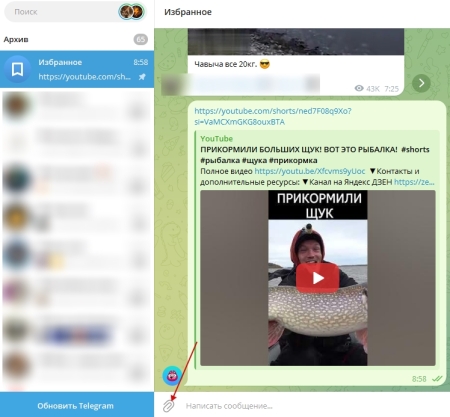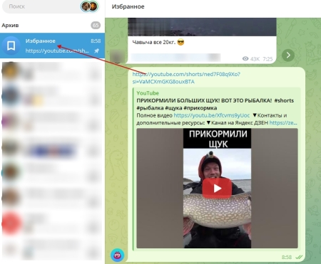 После этого выбранный файл будет автоматически загружен в хранилище. Также можно переслать любое сообщение с другого аккаунта, группы или чата к себе в «избранное».