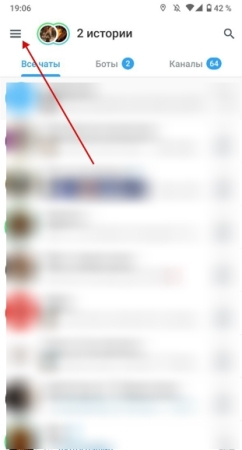 - Зайти в меню мессенджера. Чтобы это сделать, надо тапнуть по кнопке с тремя полосками, которая находится в верхнем углу слева.
