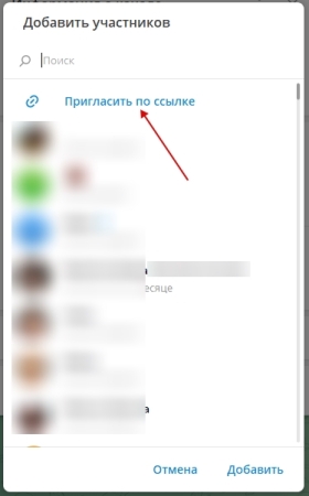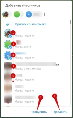 - При необходимости пригласить в сообщества людей из своего списка контактов (откроется автоматически). На этом же этапе можно и создать ссылку на Телеграм канал. Если делать это не планируется, следует нажать клавишу «Пропустить».