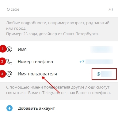 - Здесь можно поменять «Имя», «номер телефона» (только на мобильном приложении) и «Имя пользователя», он начинается вот так «@XXXXXXXX».