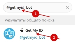 - Ниже высветятся все возможные названия – нужно выбрать именно «@getmyid_bot».