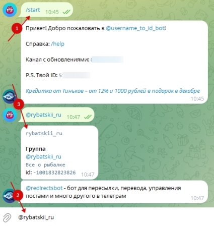 - «@username_to_id_bot» пришлёт искомый ID в нижней строке.